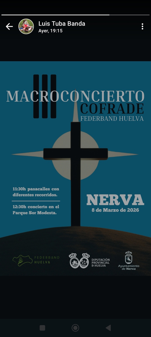 El Próximo Domingo 8 de Marzo, se celebrará en Nerva (Huelva) un Macroconcierto Cofrade organizado por FEDERBAND, donde podremos participar todos.