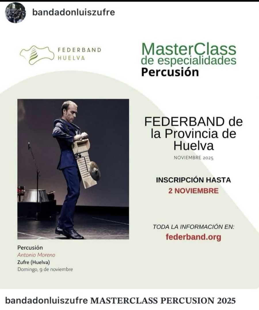El Próximo Domingo 9 de Noviembre, tendremos la fortuna de acoger en Zufre una MasterClass de la Especialidad de Percusión, impartida por Antonio Moreno.